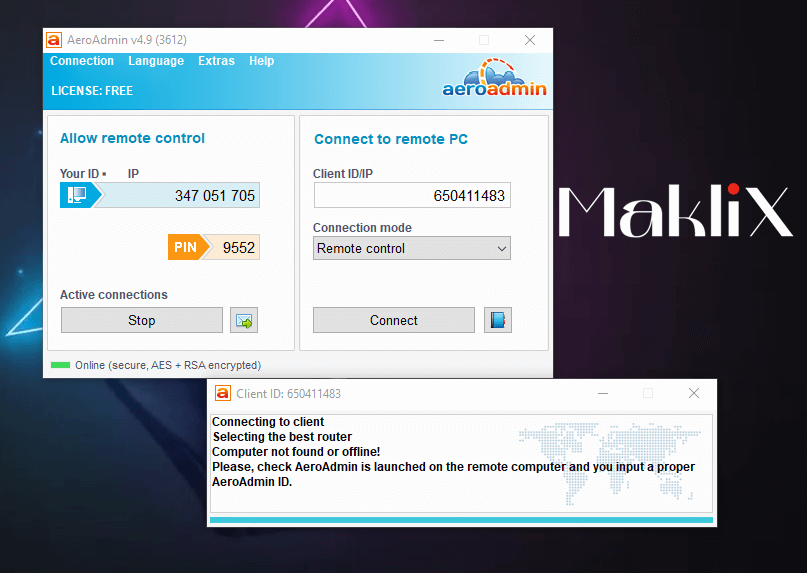 كثرت البرامج للتحكم عن بعد ولكن في الحقيقة لا يوجد أي برنامج صُمم من قبل العرب فجميعها برامج لشركات إنجليزية، ومن ضمنهما برنامج Aeroadmin الذي ظهر مؤخراَ في عام 2012 بعد الكثير من البرامج المنافسة الأخرى مثل برنامج تيم فيور أو برنامج Anydesk لكن ما يميزة في الوقت الحالي هو أنه برنامج مجاني لفترة مُرضية، كما يظهر في الصور التي في الأعلى الـ IP الخاص بك وأيضًا الـ PIN وهو كلمة المرور التي تتكون من “4 أرقام” ويمكن تغييرها مثلما وضحنا ذلك بالأعلى ومن خلالهما يستطع الشخص الدخول إلى جهازك ولكن بكل تأكيد يشترط ان يكون هناك إنترنت على كلاَ من الجهازين وأما الجزء الذي بالأيمن Client ID/IP وهي من خلالها يمكن ان تقوم بكتابة الأيدي الخاص بالعميل للتمكن من الدخول فمن هنا تتمكن.